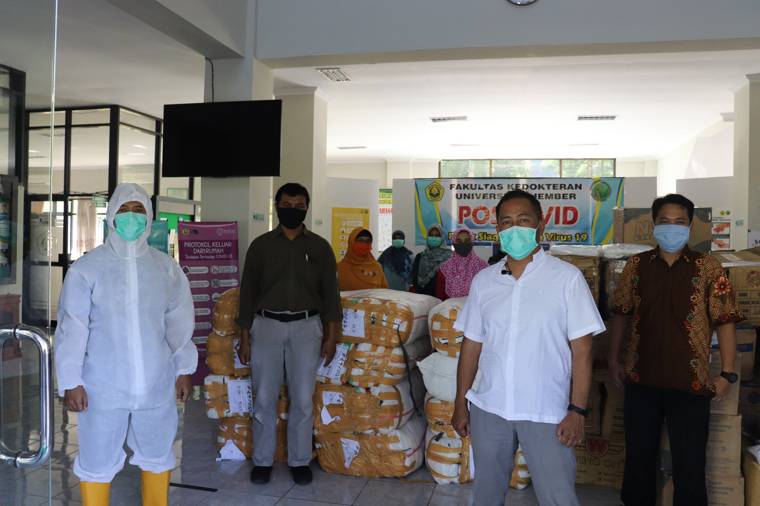 Di berikan langsung oleh dr. Supangat M.Kes.,Ph.D.,Sp.BA. selaku dekan Fakultas Kedokteran Universitas Jember, APD berupa masker, baju hazmat serta sepatu bod, diterima langsung oleh ketua satgas COVID-19 Universitas Jember dr. Cholis Abrori, M.Kes.,M.Pd.Ked. dan perwakilan Tim Pojok Siaga Corona Virus dr. Pulong Wijang, Ph.D.