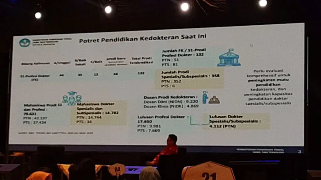 Dalam forum tersebut, dipaparkan potret terkini pendidikan kedokteran di Indonesia. Saat ini, terdapat 132 fakultas kedokteran di seluruh Indonesia yang terdiri dari 51 Perguruan Tinggi Negeri (PTN) dan 81 Perguruan Tinggi Swasta (PTS). Setiap tahunnya, dihasilkan 17.650 lulusan program studi pendidikan dokter serta 4.112 dokter spesialis dan subspesialis.