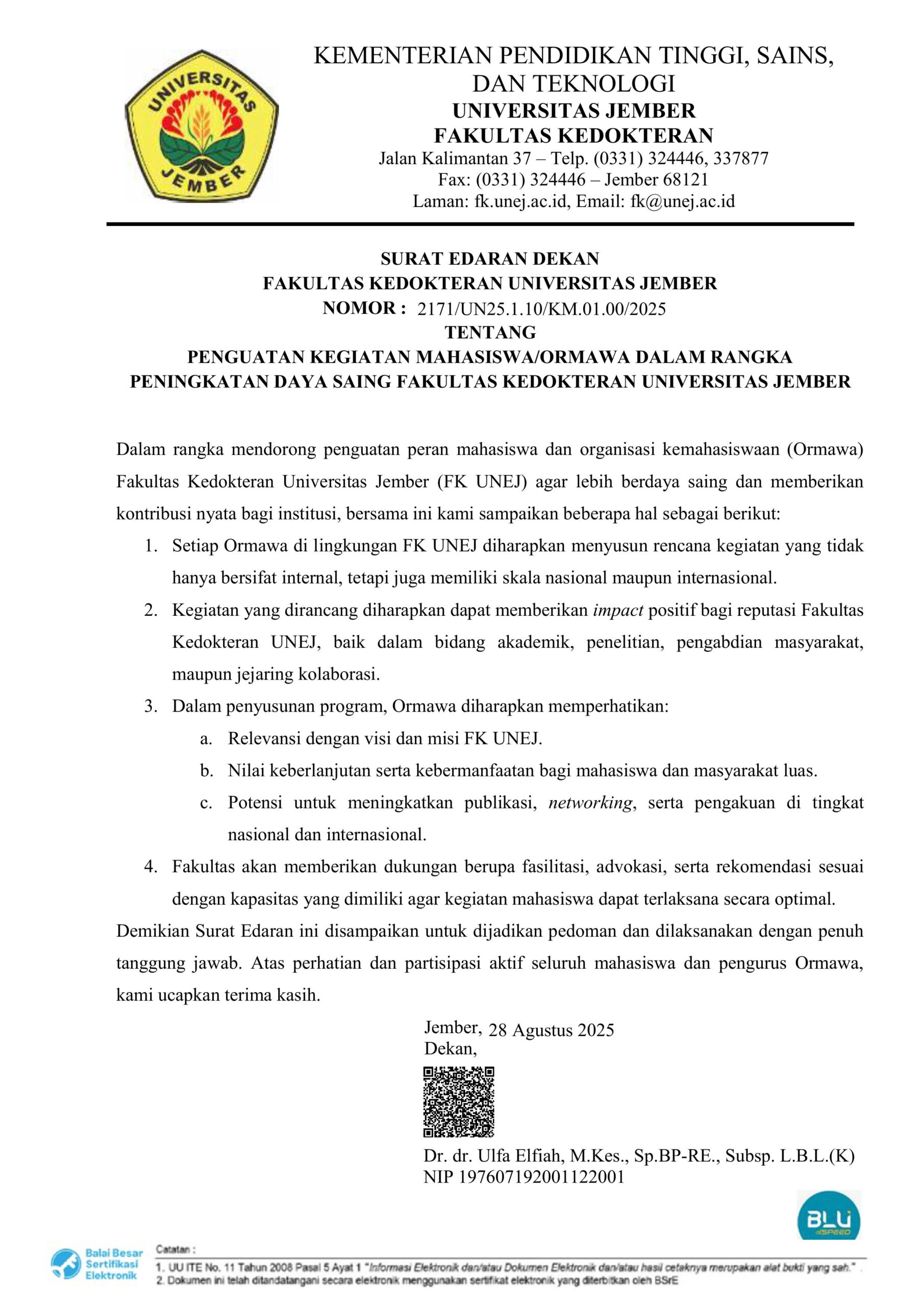 Dalam rangka mendorong penguatan peran mahasiswa dan organisasi kemahasiswaan (Ormawa) Fakultas Kedokteran Universitas Jember (FK UNEJ) agar lebih berdaya saing dan memberikan kontribusi nyata bagi institusi, bersama ini kami sampaikan beberapa hal sebagai berikut: