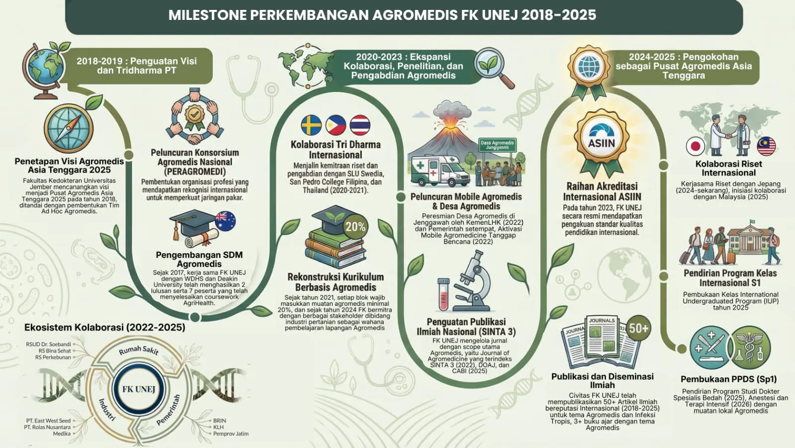 Pada periode 2024–2025, FK UNEJ semakin mengokohkan perannya sebagai pusat Agromedis di tingkat Asia Tenggara melalui berbagai langkah strategis. Upaya ini meliputi penguatan kerja sama riset internasional dengan berbagai negara, termasuk Jepang, serta inisiasi kolaborasi baru dengan Malaysia. Selain itu, FK UNEJ juga membuka program kelas internasional (International Undergraduate Program/IUP) pada jenjang sarjana sebagai bentuk internasionalisasi pendidikan. Pengembangan pendidikan berkelanjutan juga dilakukan melalui pembukaan program pendidikan dokter spesialis (PPDS), seperti Bedah, Anestesiologi dan Terapi Intensif, serta Penyakit Dalam, yang mengintegrasikan muatan lokal Agromedis dalam kurikulumnya.