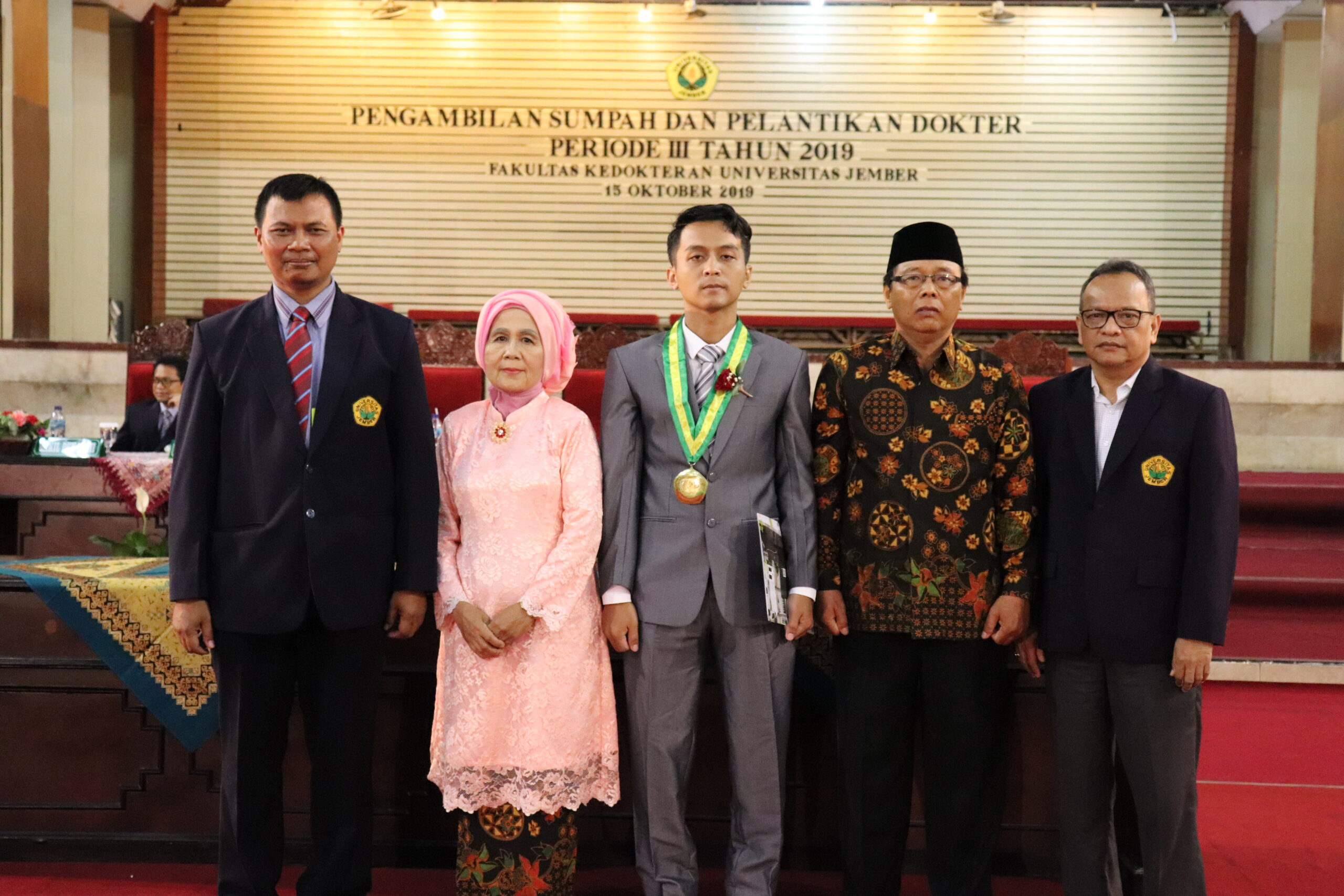 JEMBER- Fakultas Kedokteran Universitas Jember kembali menggelar pelaksanaan Sumpah Dokter untuk Periode-3 tahun 2019 pada hari Selasa, (15/10) pukul 09.00 WIB di Aula Soetardjo UNEJ. Prosesi sumpah ini diikuti oleh 31 dokter baru dan dihadiri oleh Wakil Rektor 1 Universitas Jember; Drs. Zulfikar, Ph. D., Direktur RS Soebandi Jember; dr. Hendro Soelistyono, M.M., M.Kes., Dekan Fakultas Kedokteran Universitas Jember; dr. Supangat, M. Kes., Ph. D., Sp. B.A. beserta jajarannya.
